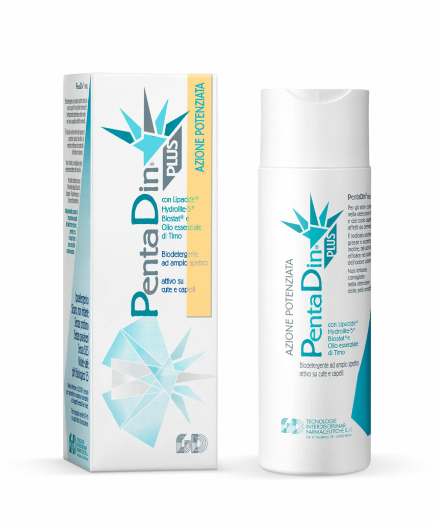 Pentadin Plus is the broad spectrum biodetergent to be used for the hygiene of the skin and scalp affected by seborrheic dermatitis but also of oily and acne-prone skin. Pentadin Plus carries out 5 synergistic actions.